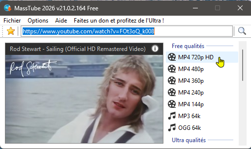 Copier l'URL de la vidéo Youtube dans le champ de saisie de MassTube ou faire un "glisser-déposer" du navigateur vers MassTube. Le logiciel analyse la vidéo et liste les formats disponibles :