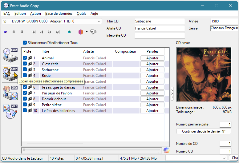 EAC va détecter automatiquement le disque et lancer sa recherche dans la base de données musicale (FreeDB par défaut) pour télécharger toutes les propriétés du CD : titre de l'album, numéros et titres des pistes, année de sortie, etc. ainsi que l'image de la jaquette via CD Cover Art Downloader :