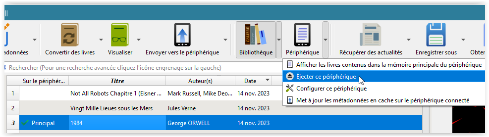 Dernière étape et non des moindres : il reste à déconnecter proprement la liseuse pour qu'elle intègre les nouveaux fichiers dans son environnement. Cela se fait en cliquant sur la petite flèche à droite du bouton [Périphérique] puis en sélectionnant l'option [Éjecter ce périphérique] :
