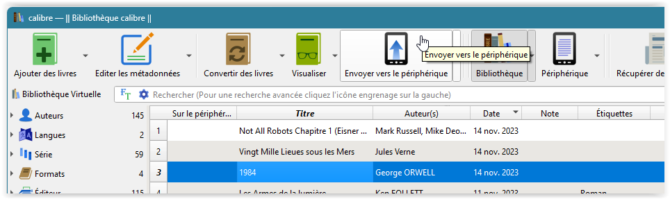 Sélectionnez l'ouvrage à envoyer sur la liseuse puis cliquez sur le bouton [Envoyer vers le périphérique]. Répétez l'opération pour chaque ouvrage à ajouter dans la liseuse :