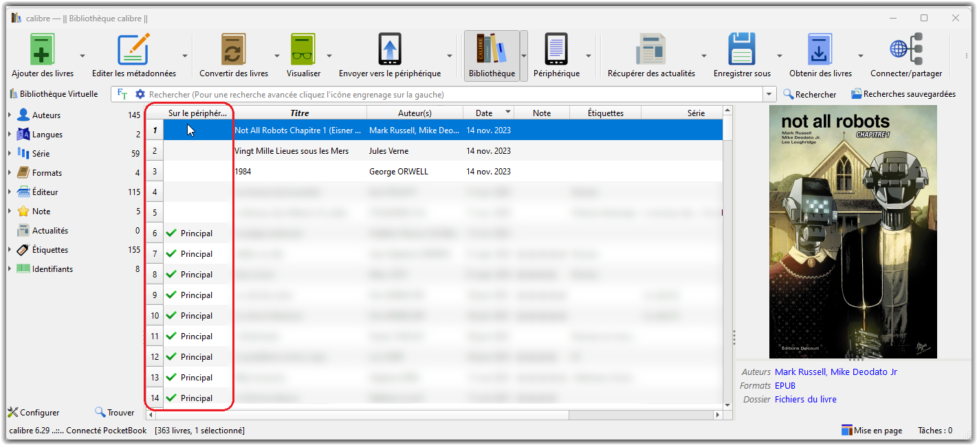 Revenez alors à calibre : la détection de la liseuse peut prendre une dizaine de secondes avant qu'une nouvelle colonne apparaisse à gauche de la liste principale pour indiquer quels ouvrages sont déjà portés par la liseuse. Cela signifie que la liseuse a été reconnue et qu'elle communique bien avec calibre :