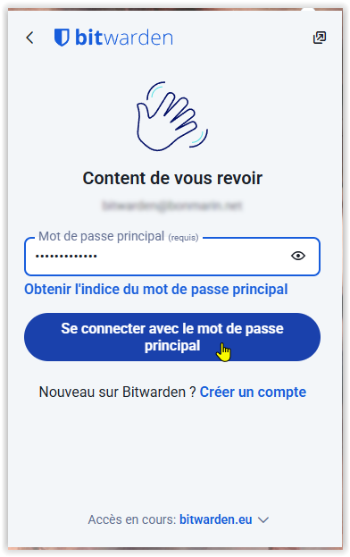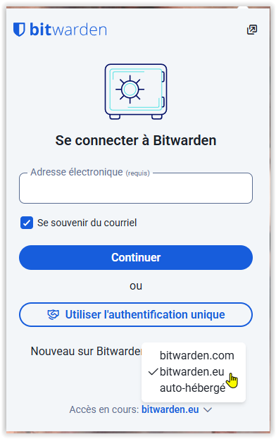 Une fois l'extension Bitwarden installée, activez-la pour enregistrer votre compte Bitwarden et le mot de passe associé :