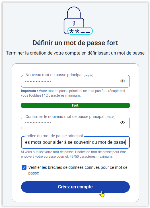 Attention : le champ "Indice du mot de passe principal" sera la seule information que le serveur Bitwarden acceptera de vous fournir si vous déclarez avoir oublié votre mot de passe. "Cela va sans dire mais cela ira mieux en le disant" : ne saisissez pas votre mot de passe dans ce champ mais un indice qui vous permettra de le retrouver !