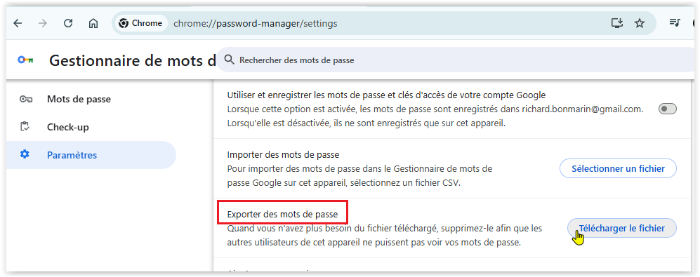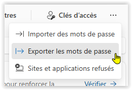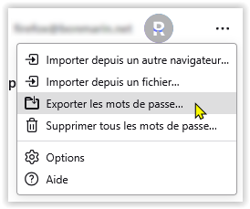 Le principe est le même pour tous les navigateurs : on affiche le menu de paramétrage du navigateur pour accéder à la page de gestion des mots de passe puis on cherche le menu permettant d'exporter les mots de passe dans un fichier.