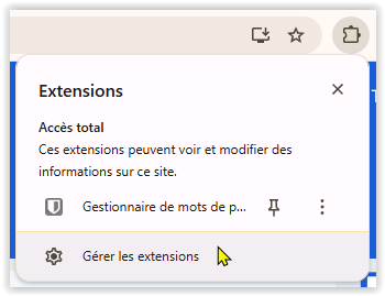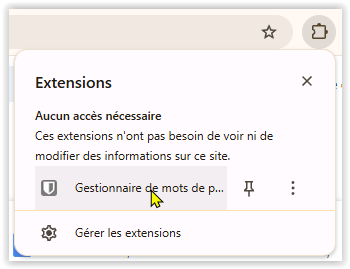 Il ne reste plus qu'à configurer l'extension pour qu'elle se connecte à votre compte personnel sur Bitwarden.eu : via la barre supérieure du navigateur, cliquez sur le pictogramme représentant une pièce de puzzle puis sur le lien "Gestionnaire de mots de passe" :