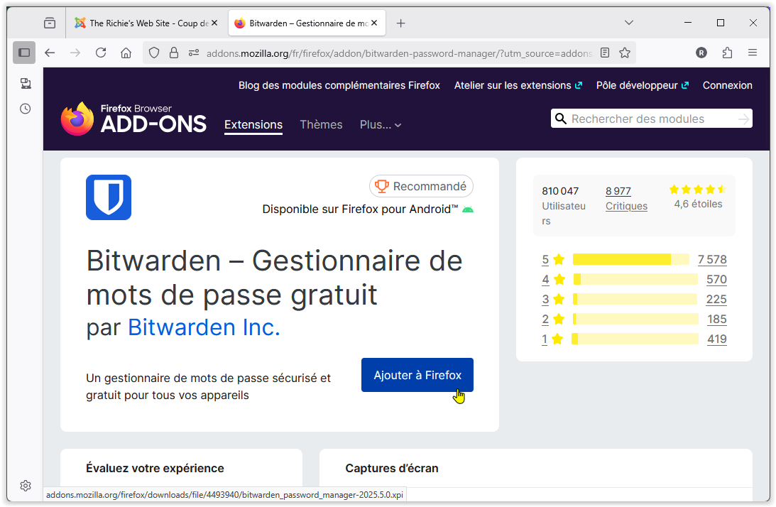Là encore, le mode opératoire est simple : après avoir lancé le navigateur choisi, on va directement sur le "Blog des modules complémentaires" de Firefox pour rechercher l'extension Bitwarden. L'adresse de ce site est la suivante : https://addons.mozilla.org/fr/firefox/search/?q=bitwarden